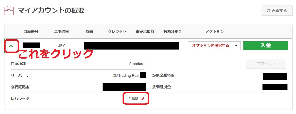 XM会員ページにログインしたら、『マイアカウントの概要』からレバレッジを確認したい口座を探します。